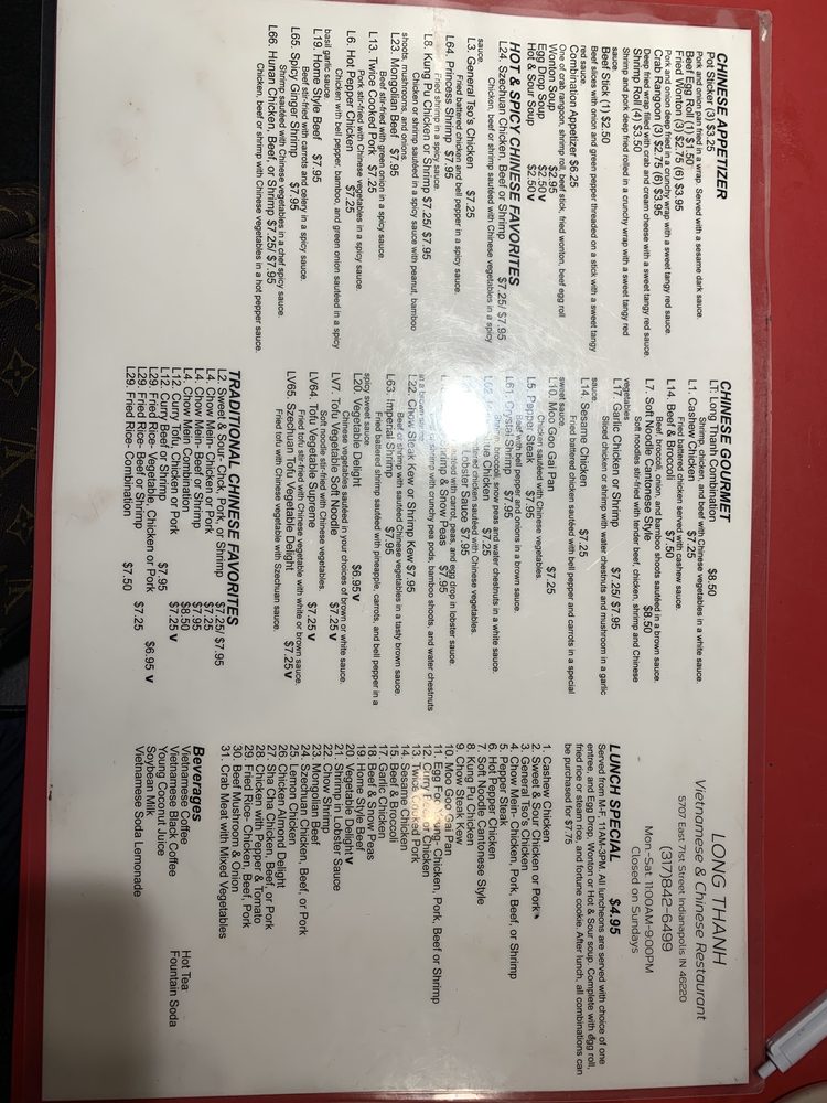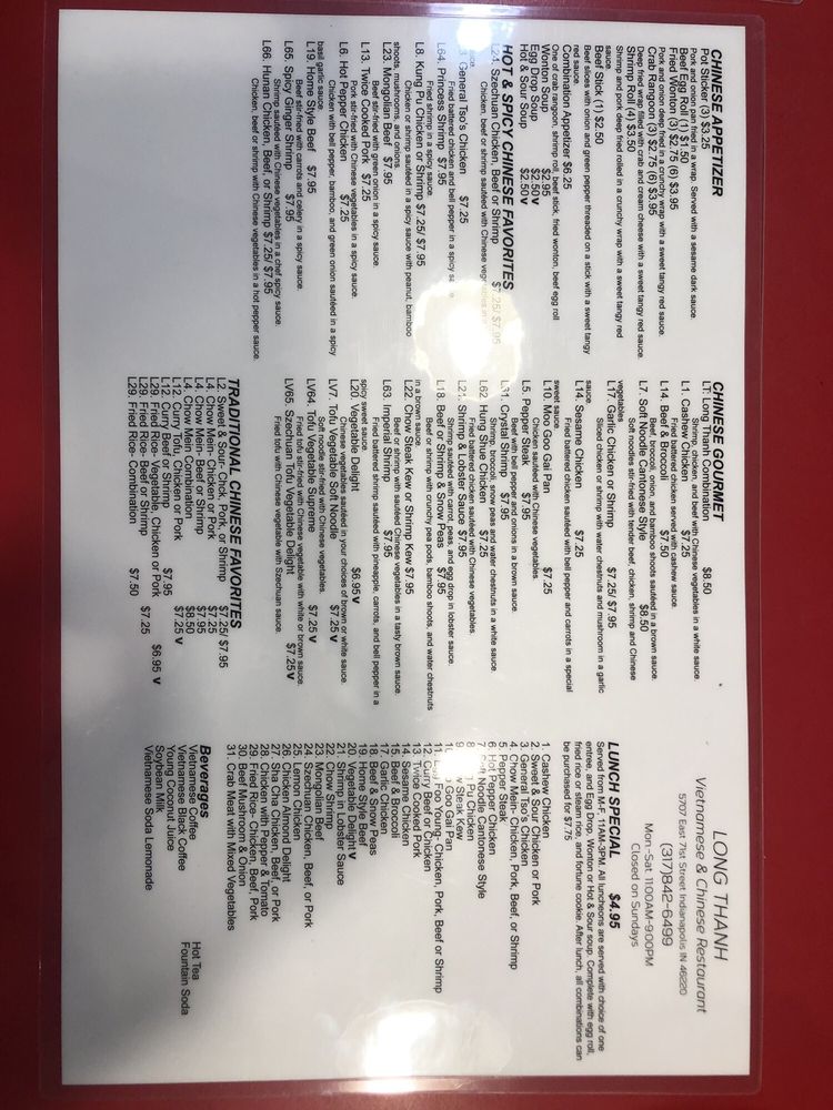 Long Thanh Chinese and Vietnamese Food is a hidden gem offering a mix of Chinese and Vietnamese cuisines. Located at 5707 E 71st St Indianapolis, IN 46220, this spot is perfect for delivery, takeout, or dining in. The menu features a variety of dishes like General Tso's Chicken, Cashew Chicken, and hot pepper options. Customers rave about the authentic flavors and friendly service, with favorites like Pho, goi rolls, and shrimp sour soup receiving high praise. The affordable prices and cozy atmosphere make it a go-to spot for those craving traditional Vietnamese or Chinese fare. Don't miss out on this culinary experience at Long Thanh!